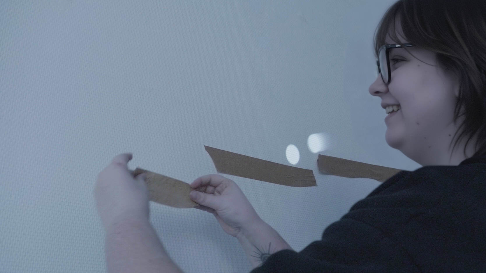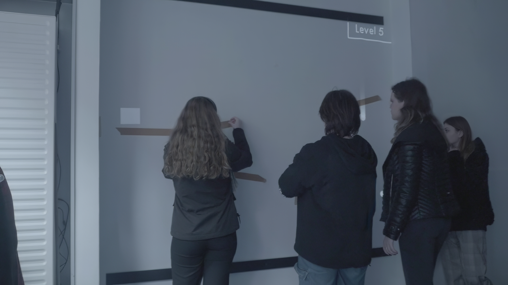 The installation uses simple materials like tape, small objects, a wall, and projected light. These physical traces become the connectors between two realities, turning the wall into a hybrid playground.