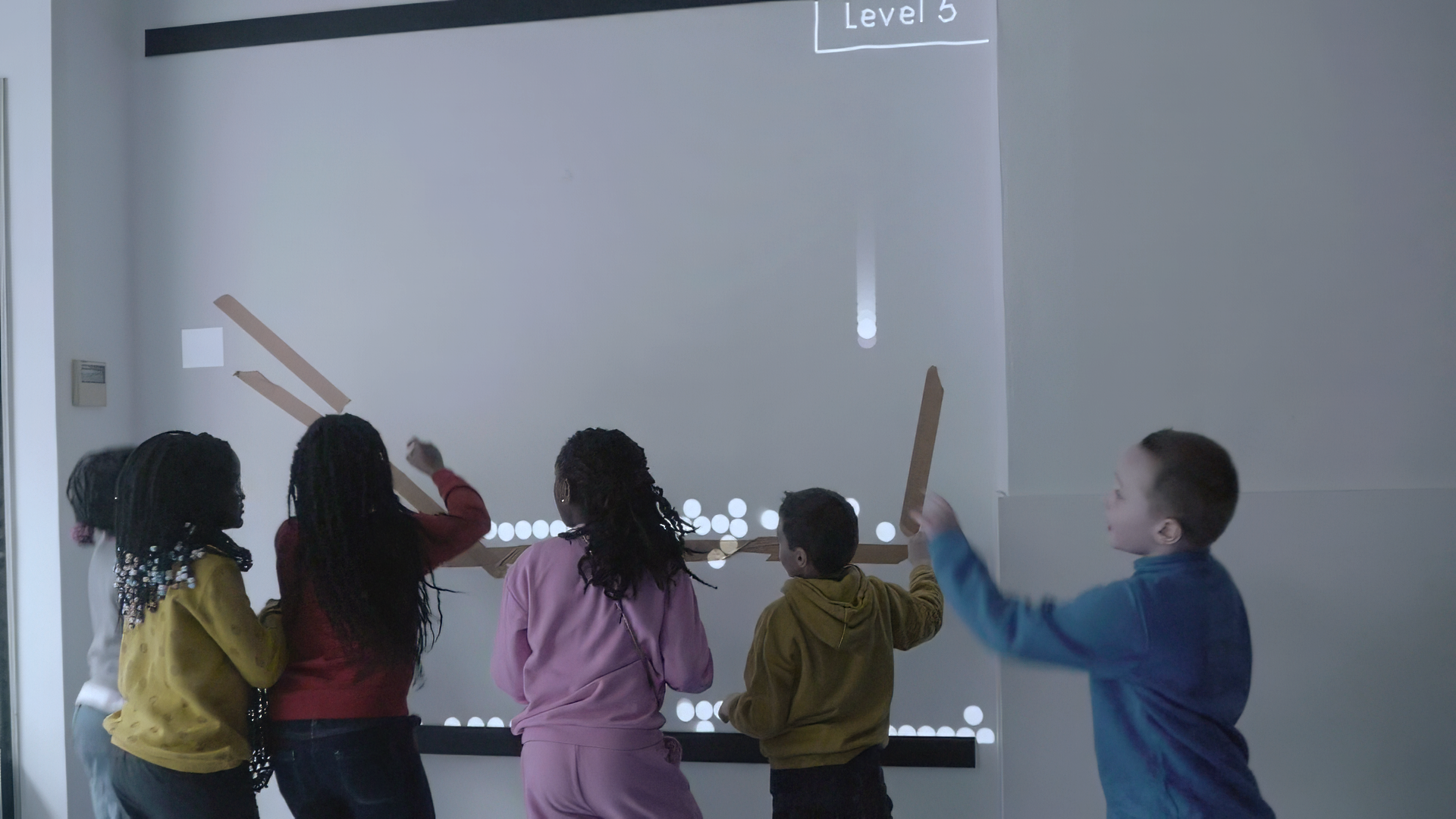 The installation encourages teamwork — participants coordinate their actions, plan trajectories, and share strategies.