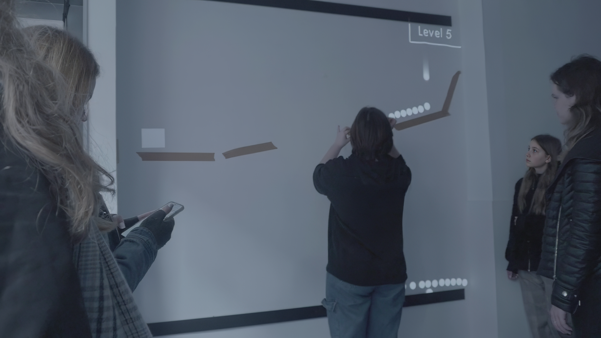 The visitor enters and sees bouncing balls falling down the wall. By placing objects on the surface, they realize they can influence their path.